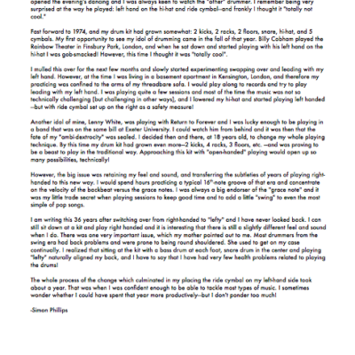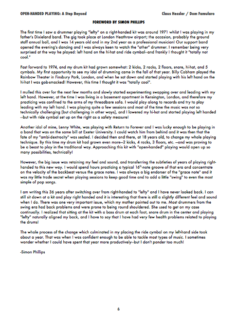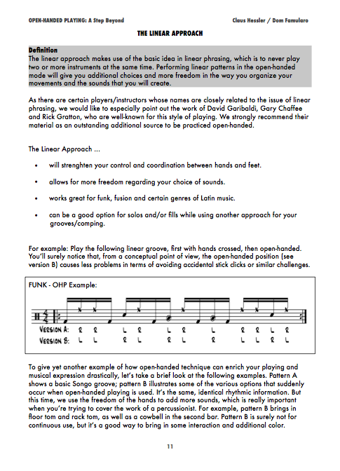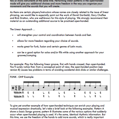 Based on the concepts of OPEN-HANDED PLAYING VOL. 1 this follow-up mostly works on linear phrasing and the use of rudiments around the drumset, using the benefits of the open-handed position. You’ll find a variaty of exercises and applications that will also complement the vocabulary of “cross-handed” players – also including some approaches about the use of rudiments that you’ll hardly find in other drumbooks (collapsed rudiments, Swiss rudiments etc.). Eight playalongs in different styles help you to experiment with the tools shown here in a musical context. Forewords by international open-handed top players Simon Philipps (Toto), Kenny Aronoff (Mellencamp) and Will Kennedy (Yellowjackets).